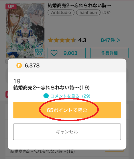 この場面でポイントが足りない場合は、「購入して読む」が表示されます。